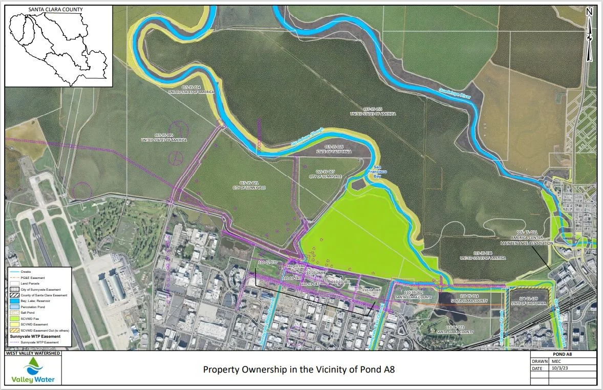 Map exhibit showing ownership and easement rights in the vicinity of Valley Water's pond A8 (click image to view larger version)