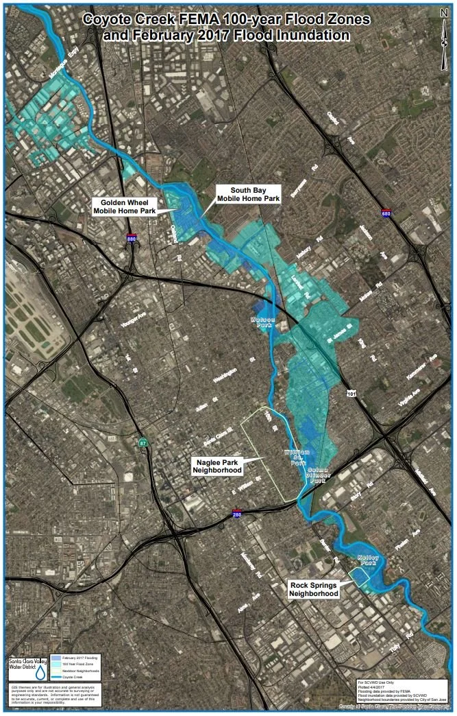 Exhibit created to show the areas of flooding during the 2017 President's Day weekend flood event in Santa Clara County in comparison to the 100 year flood zones for that area. (click image to view larger version)
